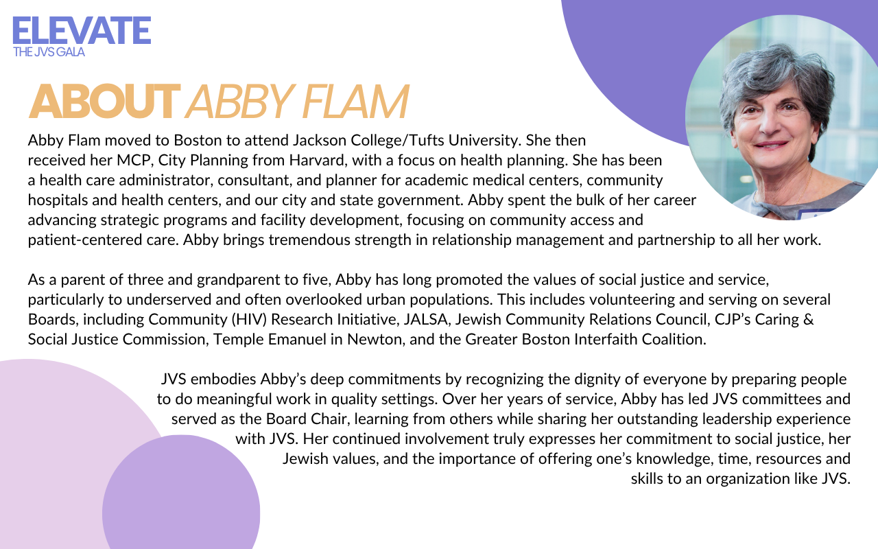 We are honoring Abby Flam for her long-time support of JVS Boston as a volunteer, donor, board member, and Board Chair. Abby’s leadership has supported JVS’s growth, from the development of career training programs to public policy advocacy. Abby leaves a legacy of impact behind at JVS, as she concludes her final year of service as JVS’s Board Chair. Click here to learn more about Abby Flam.
